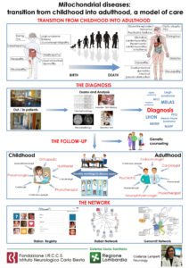 Mitochondrial Diseases (MD) are multisystem disorders where age plays a role in the involvement of various organs. During the transition from childhood into adulthood, many medical issues and concerns change and patients need a different clinical care. Thanks to expertise in both pediatric and adult pathology, the Neurological Institute C. Besta (NICB) is among the few in Italy able to take care of patients with MD from the time of diagnosis throughout the evolution of the disease, providing patients with the necessary continuity in the delicate phase of transition to adulthood. NICB provides inpatients service in the Child Neurology Division and an outpatient service for adults and child. The outpatient service allows the programming for neuroimaging, neurophysiology and blood tests, skin and muscle biopsy. Within the outpatient service, clinicians can monitor and follow up patients using new international mitochondrial assessment scales. It is also possible to have neuroftalmological and cardiological evaluation, orthopedic and pulmonary clinic with specialist consultants pertaining to structures affiliated with the Institute. Genetic counseling is provided to those families in which a patient with MD has been identified. Frequent and dedicated meetings involving all the specialists guarantee the exchange of information, essential for a correct patient’s follow-up. As part of the Italian Network of Mitochondrial Disease, we contribute to the Italian Register for Mitochondrial Diseases whose aim is to group patients into similar categories according to their diagnosis, monitoring the natural history of the disease, performing clinical trials and testing new therapeutic approaches. NICB is part of the consortium “Genomit”, coordinated by Germany, together with France, USA and Austria, whose goal, in addition to identify new disease genes and new therapeutic strategies, is to unify and integrate the Italian Registry for MD with other national registers of the Member States and to share diagnostic, therapeutic and clinical approaches. www.mitopedia.org