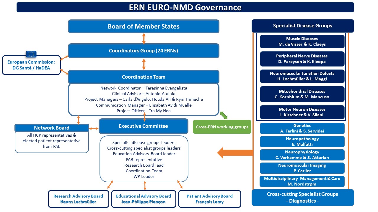The Board of the ERN will be supported by thematic groups, developed around the main groups of diseases: Muscle, NMJ, Nerve, Mitochondrial Neuromuscular diseases and ALS/MND/SMA, each of them with a spokesperson. There will be cross cutting groups, for instance ‘Diagnostic Tools’ (genetics, pathology, imaging, etc.) that will cover common issues of the different diseases. These groups will report to the Board and will help with the governance of the network.