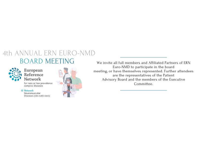 The European Reference Network for Rare Neuromuscular Diseases Euro-NMD welcomes you on January, 24th & 25th, 2022 to the Annual Euro-NMD Board Meeting, held online at 15:00-18:15 CET.