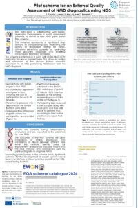 The European Reference Network for Rare Neuromuscular Disorders (ERN EURO-NMD) aims to help patients with rare NMDs in Europe to receive timely and appropriate diagnosis, treatment and care. One way to increase the number of patients receiving a faster and appropriate diagnosis is to increase the use of next-generation sequencing (NGS) approaches and improve the quality of NGS for NMDs among the EURO-NMD’s 84 Health Care Providers (HCPs) and beyond. To achieve this, EURO-NMD, in collaboration with the European Molecular Genetics Quality Network (EMQN), has established an External Quality Assessment (EQA) scheme for rare NMDs. The rationale behind is that while different labs use different NGS approaches for genetic diagnosis, there is no standard methodology to assess the quality of NGS-based diagnosis of rare NMDs; whereas common diseases have benefitted from EQA schemes for years. This lack of a standard to measure quality is the reason why EURO-NMD is establishing an EQA panel testing scheme to assess the analytical process and reporting of NGS-based tests for NMD diagnosis. The scheme will be open to all labs performing NGS-based tests for NMD diagnosis (including targeted panel testing/virtual panel/clinical exome/WES/WGS), but EURO-NMD HCPs performing both wet and dry NGS-based tests will be the first groups able to apply as part of a pilot scheme starting in 2024. While the scheme focuses primarily on LGMD genes, testing can be performed using any appropriate gene panel for NMDs, as variants outside the scope of an individual laboratory’s panel will be excluded from assessment.